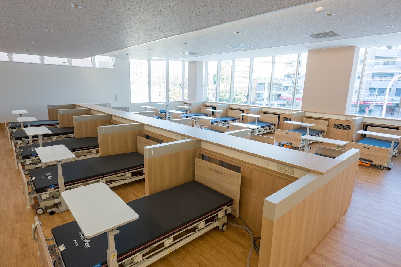 プライバシーに配慮しつつ、患者さんの体調変化にすぐ気づけるよう工夫したレイアウトを採用しています。ベッド間には1m以上のゆとりを確保し、落ち着いた環境で安心して透析治療を受けていただけます。